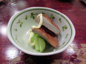 「なんこつ煮」を出してくれました。鹿児島では豚の軟骨をトロトロに煮込んで良く食べるそう。見るからに美味しそうでしょ。いやホント柔らかくて味が染み込んで旨いのなんの。