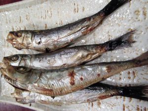 「かつおのハラ皮」。カツオの腹の身の部分を塩焼きしたもの。 脂がのってて弾力のある歯応えが癖になります。