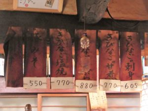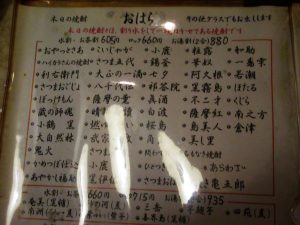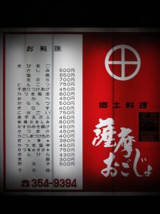 店先には薩摩料理の品書が輝いてます。先日の鹿児島で頂いた物もあれば初見の物も。ワクワクしてきました!