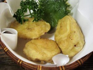 「からいも天ぷら」。「からいも」とは「さつまいも」の事だそう。この甘みにはコレだろうと‥