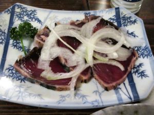 「カツオ」です。「茶ぶり」とはエサに緑茶を混ぜて育てた「ぶり」だそうで甘味のある脂が特徴。でもしつこくないんですね~。そして「辰巳屋」さんで頂いた「キビナゴの刺身」が忘れられなくてこちらでもお願いしようと思ったらマスターに先に言われてしまいました。「ここんところ、揚がらないんでね、きびなご刺しないんですよ」。エェ~残念。一番の目的で来た物がないとは。そうなると‥