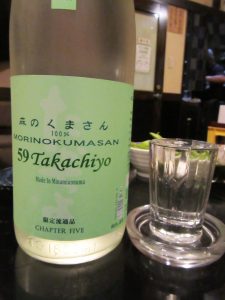 酒は名前に惹かれて「59Takachiyo 森のくまさん 純米吟醸無調整生原酒 」。全く知らない酒でした。新潟は南魚沼の「高千代酒造」のお酒。生酒だけに酸味が強いですが決して暴れないところはさすが新潟の酒ですね。刺身との相性もとても良い。