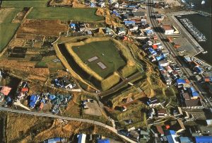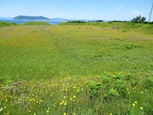 最初に訪ねたのは函館空港そばの「史跡 志苔館跡」。何処それ?と思うかもしれませんがれっきとした城跡です。上空から見た写真でハッキリと郭の形が見てとれます。