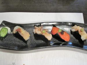 「つまみ寿司(四貫)」を頂きました。左から「マイカ(肝乗せ)」・「ホッキ」・「サーモン」・「ツブ」そして「タラバ」と北海の魚介を堪能です。