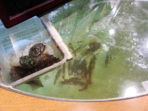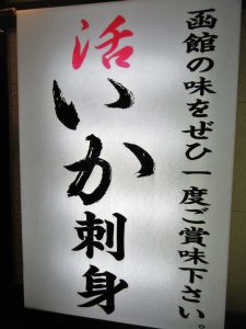 イカの水槽。先程の「活いか刺身」の文字とそこに添えられた「函館の味をぜひ一度ご賞味下さい」の言葉を思い出しました。なるほど、ここで泳ぐイカを提供するんですね。これは楽しみです。