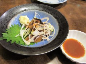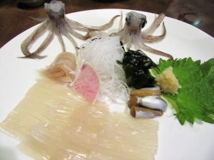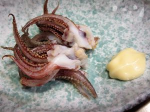 そしてメインの「活真イカ刺」。先程の水槽で泳いでた連中です。もちろんまだ動いてます。‥だけあって身はコリコリしてとても甘い。これだけ鮮度の良いイカは呼子のイカ以来ですね。旨いです。下足は‥