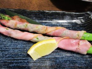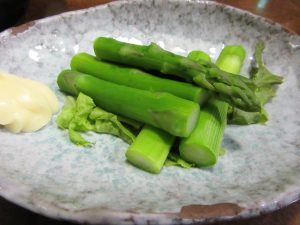 肴は北海道らしく野菜を中心に‥。まずは「地物アスパラ茹で」と‥