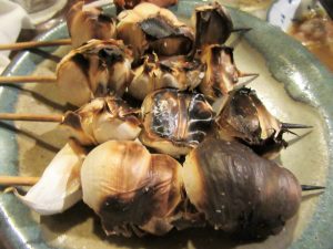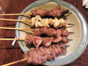 串ものは「焼き(もつ)盛り合わせ5本」をチョイス。さっき見た店先の焼き場で焼いたんでしょうね。炭焼きのお陰で香ばしくプリプリの触感。