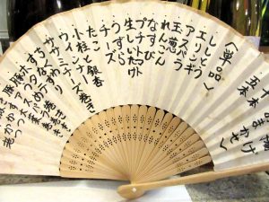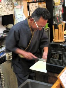 防府の街は静かであまり人を見かけなかったのですが店に入ると満席状態。なんとかカウンターが空いていたのでそこに座り扇子に書かれた品書き眺めながら‥