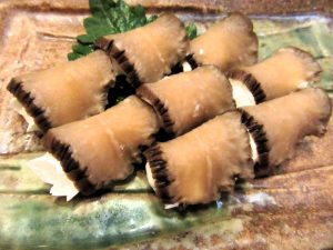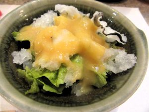 お通しは「鯨のおばいけ」。初めて頂きますがこれは山口県の郷土料理だそうです。くじらの尾びれの部位だそうでコリコリとした食感が楽しい。最初から郷土料理を頂けるとは期待が膨らみますね。