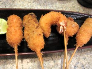 それじゃ屋号にもあった「串揚げ」を頂きましょう。左から「ササミチーズ巻・牛かつ・海老・豚アスパラ巻き・小柱と銀杏」