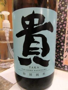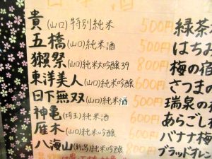 山口に来たからには地酒を吟味。まずは一番上の「貴」の特別純米を燗酒でお願いしました。