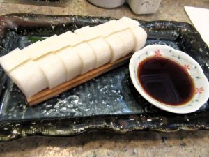 チョイス。「板わさ」「板わさ」と言えば関東?と漠然と思ってましたが山口の方には当たり前の肴。関東風と違うのは「かまぼこ」「ワサビ」をサンドしているところ。そもそも「かまぼこ」のプリップリッの弾力が凄い! これは良いです。