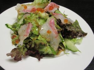 品書きには「サラダ」とありましたが「鯛」と「イクラ」がしっかり盛られてるのも嬉しいです。この時季でも冷たい野菜とビールは意外に合います。