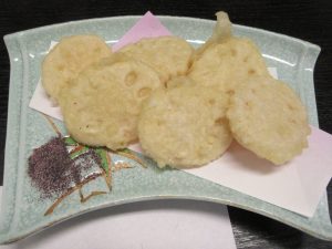 根菜を一品。「れんこん天」。「紅しそ塩」で頂きます。