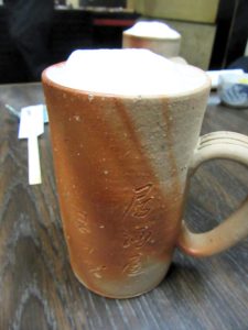 「生ビール」を。「生ビール」は陶器のジョッキで注がれます。