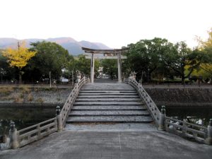 振り返ると「神幸橋(太鼓橋)」の起伏が良く分かります。そして、その先には石造りの「大鳥居」。背後には「南予アルプス」「尻割山」がそびえています。