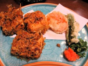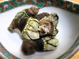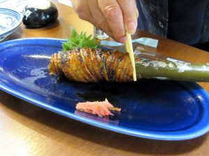 「太刀魚竹巻」。どれもこれも帰ったら食せない物ばかりでついつい頼んでしまいました。「小エビ」と言いながら大きく身の締まったエビを塩茹でで頂く。「亀の手」はまるで亀の手のようですが甲殻類の一種。磯の香り漂う塩味と甘味がとても美味。「じゃこ天」はこちらではお約束の逸品。そして「伊予豆腐」。伊予市名産の豆腐を揚げたもの。最後の「太刀魚竹巻」は見た目もハードでどうやって食すか分からず女将さんにほぐしてもらいました。その手さばきが‥