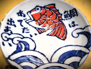 案内された席に着座するとテーブルの小皿が目に入りました。そこには「鯛はめでたい出あい」の文字が。そうです、そうです ! 今日は「鯛(めし)目当です。