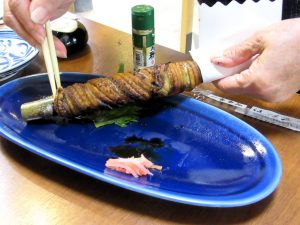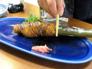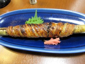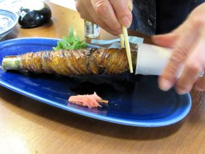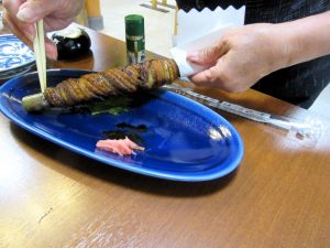 見事。「太刀魚」が巻かれている竹串を綺麗に抜いてもらってから、その身を頂きます。肉厚の身に特性のタレが塗られ、竹と一緒に炭火で焼かれたその味わいは香ばしくて、とても美味。これは貴重な体験です。