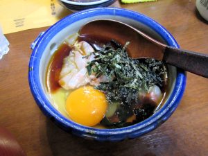 いよいよメインであり〆でもある「宇和島鯛めし」を。美味い ! 歯応え抜群の鯛と生卵と海苔そして店特性のタレで頂きます。スルスルと入ってしまってアッという間にたいらげてしまいます。でも、ご飯のお代わりも出来るのでお腹いっぱい食べたい人にも安心の一膳です。