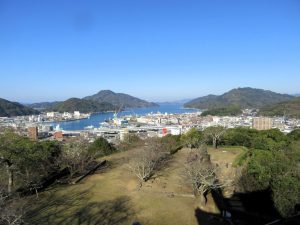 標高80m程の丘陵に建つ「平山城」。山頂までの歩きは程よい朝のトレッキングになりました。「本丸」から見る「宇和島港」の景色は爽快そのもの。ここから市内の北に建つ「和霊神社」まで足を延ばそうと「宇和島城下」へ。