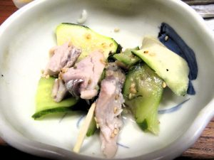 「りゅうきゅう」。この名を聞くと「大分県」の郷土料理を思い出します。その名が「高知」にもありました。但し「高知」では「りゅうきゅう」と言えば「ハスイモ」の葉と茎のつながる葉柄部分、つまり食材の事を言うそうで「大分県」のそれとは違うようです。但し今回は「ハスイモ」ではなく「ズッキーニ」だそうでそれを「りゅうきゅう」と呼ぶから何だか分からなくなってしまいました。ただ食感はシャキシャキして酢も良く効いていて、とても美味しかったです。