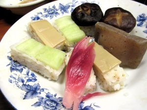 最後は「田舎寿司」で〆ます。まさか、これが出てくるとは思いませんでした。以前から食べてみたかった郷土料理。ネタは「椎茸・ズッキーニ・いたどり・ミョウガ」と「こんにゃく」。是が非でも食べたいと思っていたので感動ものです。程よい酢が「桂月」との相性を際立てます。ここまで郷土料理で、もてなしてくれたのは予約しておいたと言うのもありますが女将さんの喜んでもらいたいと言う心遣いなんでしょうね。最後に店を後にする時、掛けてくれた「寄って(酔って)くれて、ありがとう」の言葉が忘れられない想い出になりました。こちらこそ有難うございました。そして最後は‥