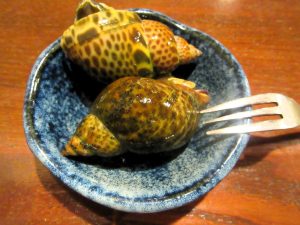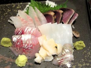 最後は山陰の地魚を。左上から「えのは・芋がつお・赤水・白いか・白バイ・真あじ」の6点盛り。初めて聞く名は「えのは・芋がつお・赤水」の3品。それぞれ「ヒイラギ・キジハタ・ソウダガツオ」を山陰ではこう呼ぶそう。柔らかさとコリコリ感がマッチしるのは新鮮さのあかしでしょう。美味しいですね。