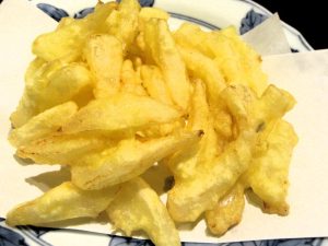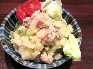 定番「ポテトサラダ」も頼みます。「ポテサラ」は日本中どこの居酒屋にも大体ありますが全く地域性は無いと言うのが僕の考え。それよりもお店によって味の違いが強い印象。東北地方の何処かで食べた「ポテサラ」が九州のこのお店の味に近い、なぁ~んて事が良くあります。「あやめ亭」さんの「ポテサラ」はマヨ少な目でポテトの食感を残している、そんな感じ。美味しい。つい最近、何処かで食べたのに近いなぁ~。