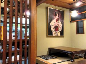 店内はいたってシンプルな普通の飲み屋さん、といったところでしょうか。カウンターが数席と広めの小上がりが3卓。気取らない雰囲気が一見の身でも落ち着かせてくれます。壁面に飾る女性の絵。誰なんでしょう?