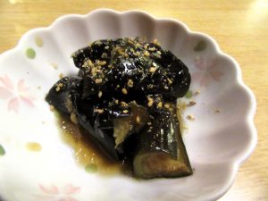 お通しの「茄子の煮浸し」で喉と小腹を満たします。