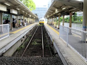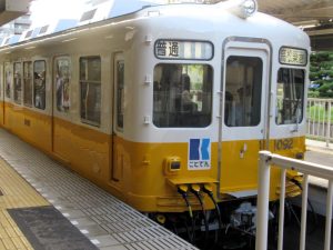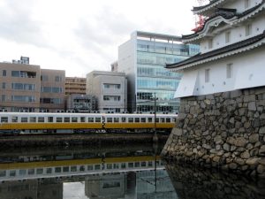 この橋に平行して「高松琴平電気鉄道」通称「ことでん」の始発駅「高松築港駅」のホームが堀の向こうに見えます。折角ですから、その「ことでん」に乗ってみましょう。