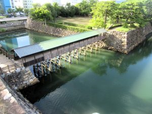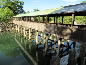 「内堀」に架かる「鞘橋」は「二の丸」から「本丸」を結ぶ唯一の連絡橋。屋根を有するこの姿は何とも言えない風情があります。屋根が付いたのは江戸時代の中頃と言いますから平和な時代の象徴ですね。
