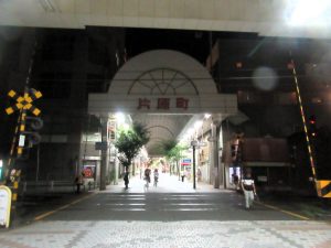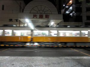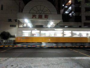 先程の「鞘橋」を車内から眺めながら、ゆっくりと動き出します。乗車したのは宿の最寄り駅、隣の「片原町駅」まででしたが何とも言えないノスタルジックな感傷に浸る事が出来ました。「片原駅」からホテルに戻り日が暮れるのを待ってから再度、「片原町」へと繰り出します。