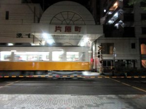 「片原町駅」は片原町商店街沿いにありますが「ことでん」自体は商店街のアーケードを分断するように走っています。アーケードの中を歩いて行くと丁度、踏切が閉まり先程の黄色とオフホワイトのツートンカラー「ことでん」が商店街を横切って行きました。