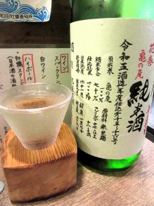 そこに地酒「悦凱陣 花巻亀の尾 山廃純米 生」を合わせます。「こんぴらさん」で有名な「金刀比羅宮」に繋がる金毘羅街道沿いにある酒蔵「丸尾本店」の地酒。濃厚で酸味を良く感じる酒です。