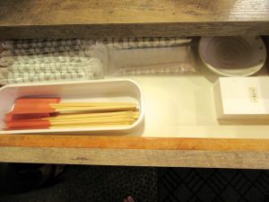 立ち呑みと言う事で店内はカウンターのみ。カウンターの下は引き出しになっていて、ここに箸やおしぼり、小皿が入っています。