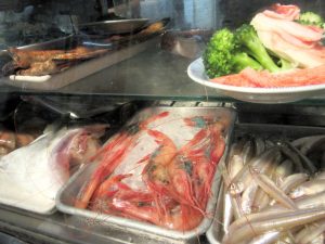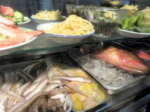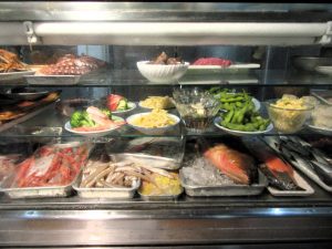 当然ですが、いまだ店内は満席状態。通された席はカウウンター中央に鎮座する肴のショーケースの真前。