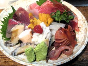 そして「刺し身盛り合わせ」。赤身にカツオ、カンパチ、バイ、イカ、赤貝、さらにウニとハモまで。特筆すべきは身の厚さ。たまりません。
