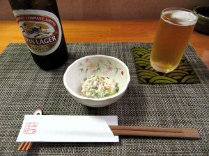さてまずは「瓶ビール」にお通しの「白和え」を。この絵は中々、良いです。昭和の頃、僕の父親が仕事から帰って来ると父の前に、この絵があった事を思い出します。そんな感じのお店です。
