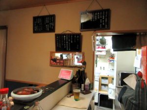 大通りに面した門には暖簾が。そこを潜り引き違い戸を開けると玄関。そこは「今晩は~」とも「ただいま~」とも言いたくなる様な雰囲気。僕は「今晩は~お邪しま~す」と言いながら靴をぬいで上がらせてもらいました。上がった奥の部屋が5人掛けのL字カウンター。玄関を上がった左横にも座敷があります。今回は開店の同時刻に席をお願いしておきました。なので本日、最初の訪問者になります。