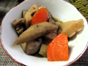 筑前煮」が届きます。屋号の家庭料理らしく何か懐かしい味付けのような気がします。これは育ったり住む地域に関係なく抱く印象じゃないかな。美味しいです。