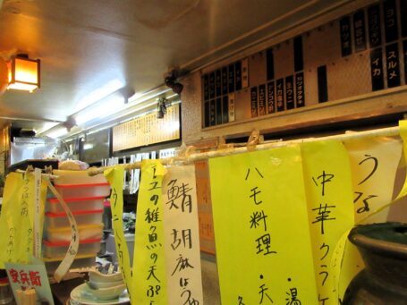地元で人気の老舗居酒屋「安兵衛」さん。外観を見ても感じる渋さが光っています。何でも創業から60年以上だそう。中に入ると満席状態。何とか‥