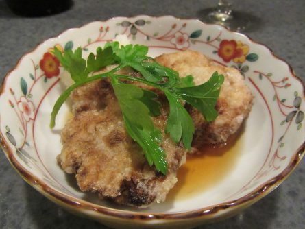 お通しです!お通しは揚出し豆腐ならぬ「揚出し里芋」。いやいや美味しいです!
