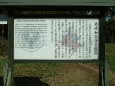 変わりに屋敷跡という形で砦跡地に案内板が立っています。ここは「柿崎和泉守屋敷跡」。屋敷跡の中でもかなり広い場所です。
