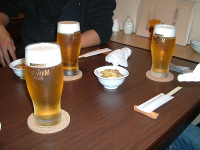 時間は夕方5時。他のお客様はまだのようです。それではさっそく席に着いてまずはビールで喉を潤しましょう。