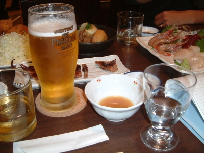 左端に写ってるお酒はお店のサービスで梅酒を戴きました。スッキリしていて美味しいです。確か関西の方の酒蔵だったかな。肴は〈刺身の盛り合わせ〉に〈富山産の丸干しイカ〉と弟お奨めの〈串カツ〉。刺身は鮮度が良く美味しいですね。美味しい刺身にはお酒なんですが〈生プレ・モル〉だからもう一杯、頼みました。