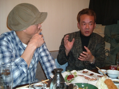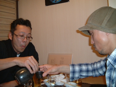 「ゴクリ。うぅん。なにか違う。僕の知ってる蒼空じゃない。哲ちゃんどう?」「うん。確かに違う。」この〈蒼空〉という地酒は京都伏見の小さな蔵で酒造していて確か純米酒しか無いと聞いている。だけどラベルを見ると純米吟醸と書いてある。「うーん。もし純米吟醸があるんだとしてもいつも戴いている純米酒の方が数段美味しいよね。」上の写真、右が僕ですがかなりその辺の事、力説しています。だけどこれはこれでそれなりに美味しかったです。なんといっても仲尾さんがわざわざ僕の為に用意していてくれた訳ですから。