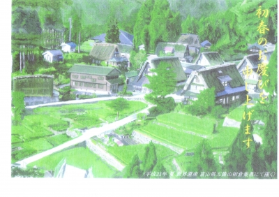 上の水彩画は今年お客様にお出しした年賀状です。昨夏、世界遺産でもある「富山県五箇山相倉合掌集落」を訪れた時の風景を自筆で描いた物です。僕は子供の頃から絵を描くのが好きで一時期そういう関係の仕事もしていました。今は趣味で少し描くくらいです。機会があれば又この場に掲載します。